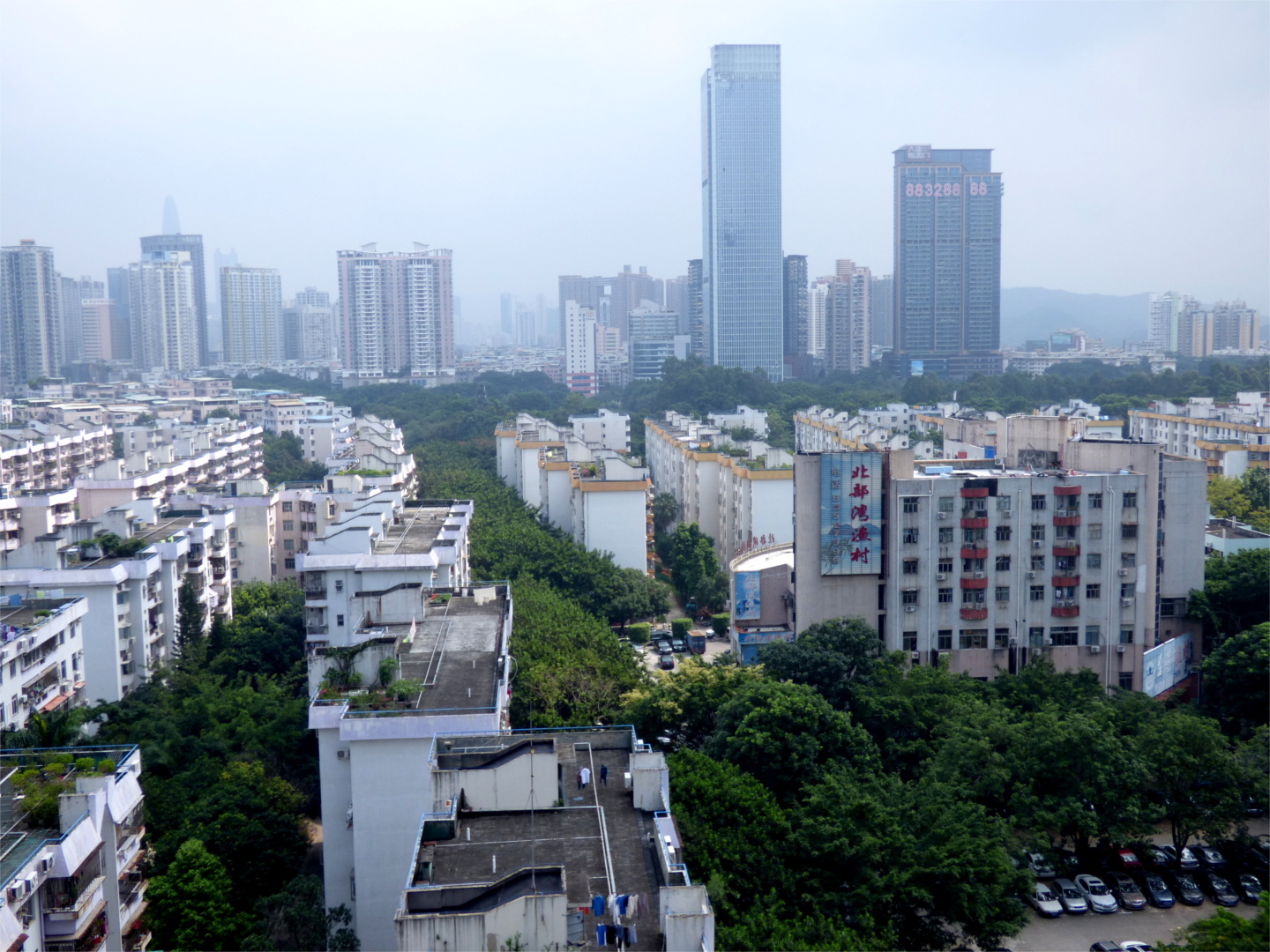 The next morning we see Shenzhen in daylight for the first time — and the view from our hostel is quite nice to be honest, even if slightly smoggy.