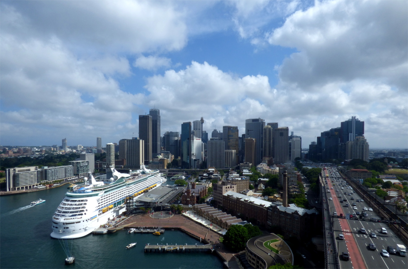 Anschließend steigen wir noch auf einen der Türme der Harbour Bridge, von wo man einen guten Ausblick auf Sydney, den Hafen und das riesige Kreuzfahrtschiff, auf dessen Deck Passagiere surfen, genießen kann.