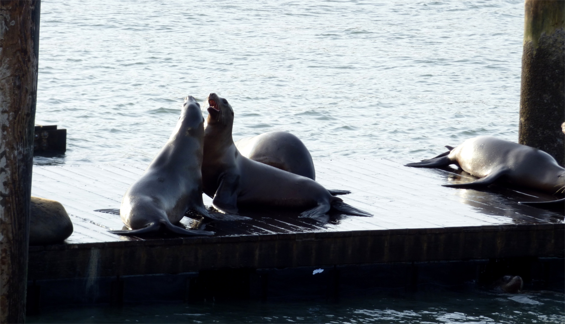 Zwischen den Menschenmassen, die an uns vorbeiströmen, finden wir auch die einheimische Seelöwenpopulation, die auf kleinen Holzinseln im Wasser die Sonne genießt.
