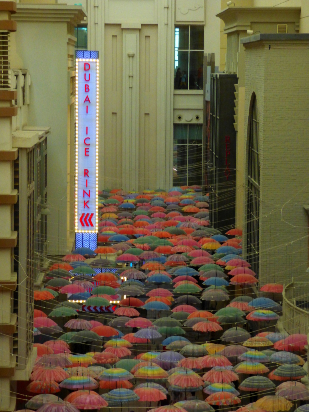 Interior of a sandstone-coloured mall with colourful umbrellas suspended from the ceiling to provide an outside-atmosphere, photographed from above. A vertical sign reads 'Dubai Ice Rink'.