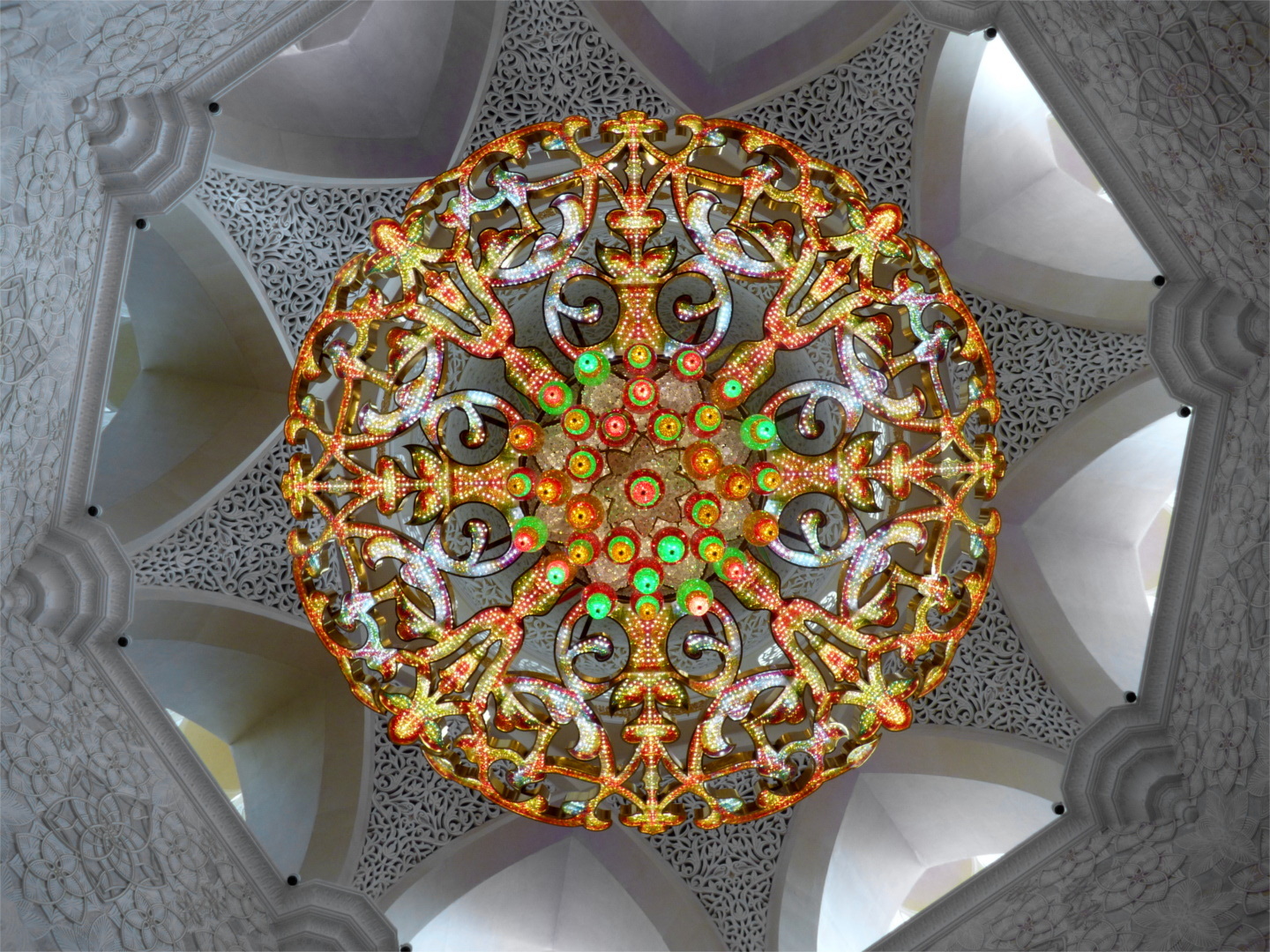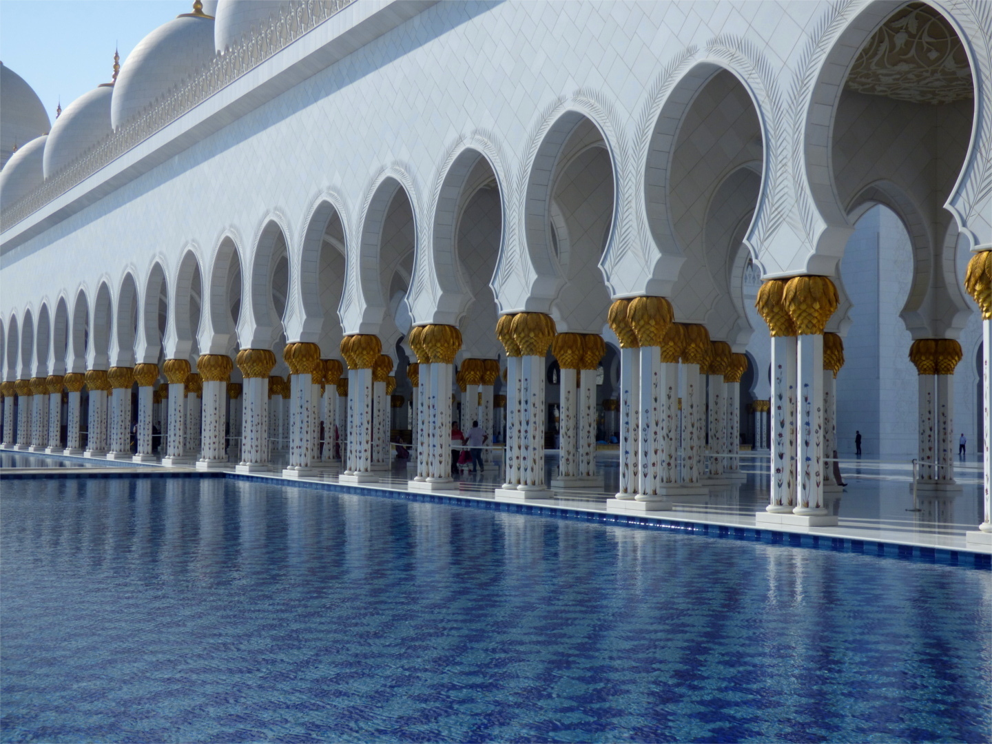 When entering the prayer hall, where the Friday prayer is held, we once more realize that we are indeed in the emirates: The hall is insanely large, incredibly pompous, and in a corner an escalator leads down to the toilets. We were also shivering quite a bit in in the main hall, where the air-con is apparently set to what feels like 16°C.