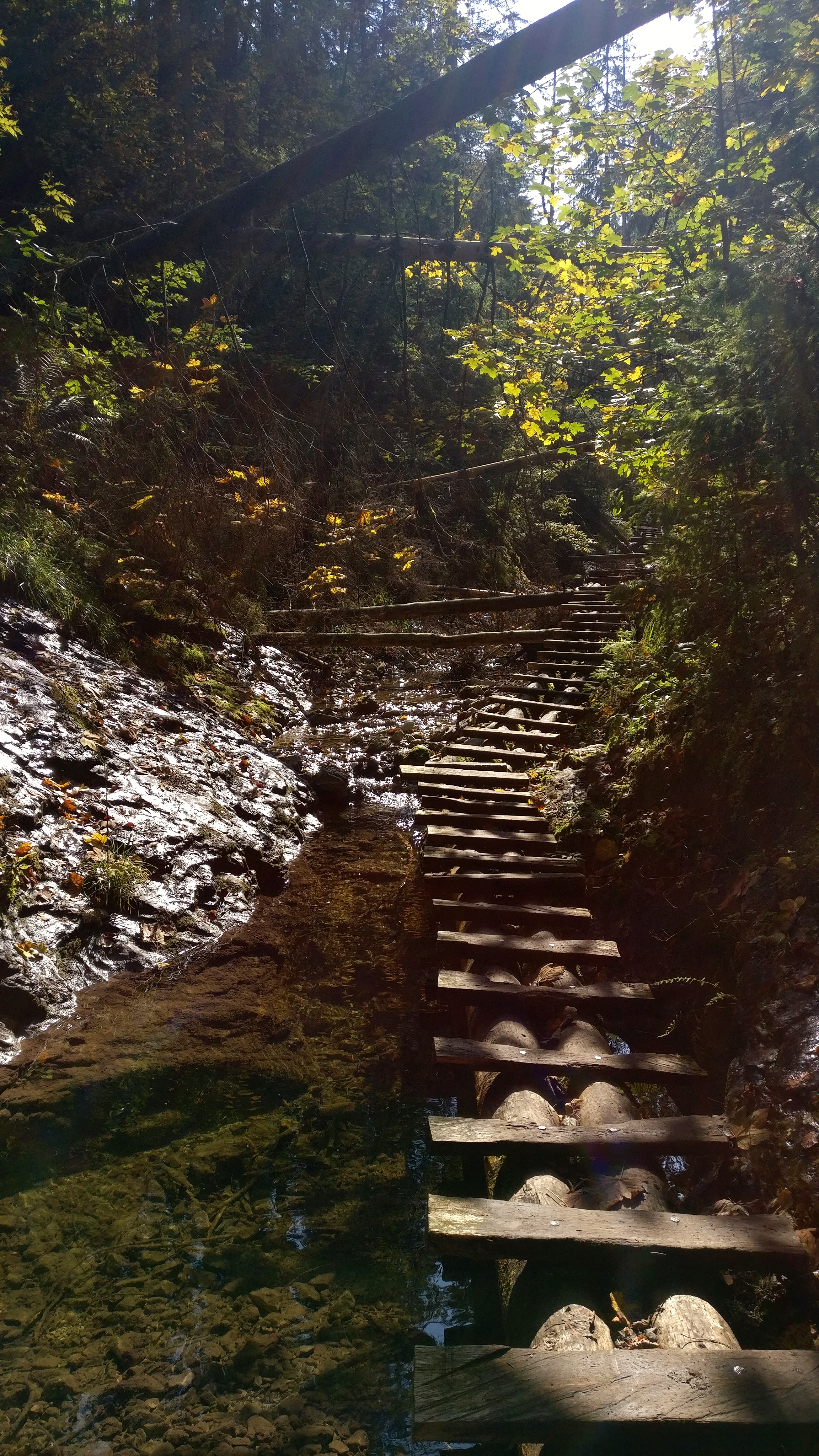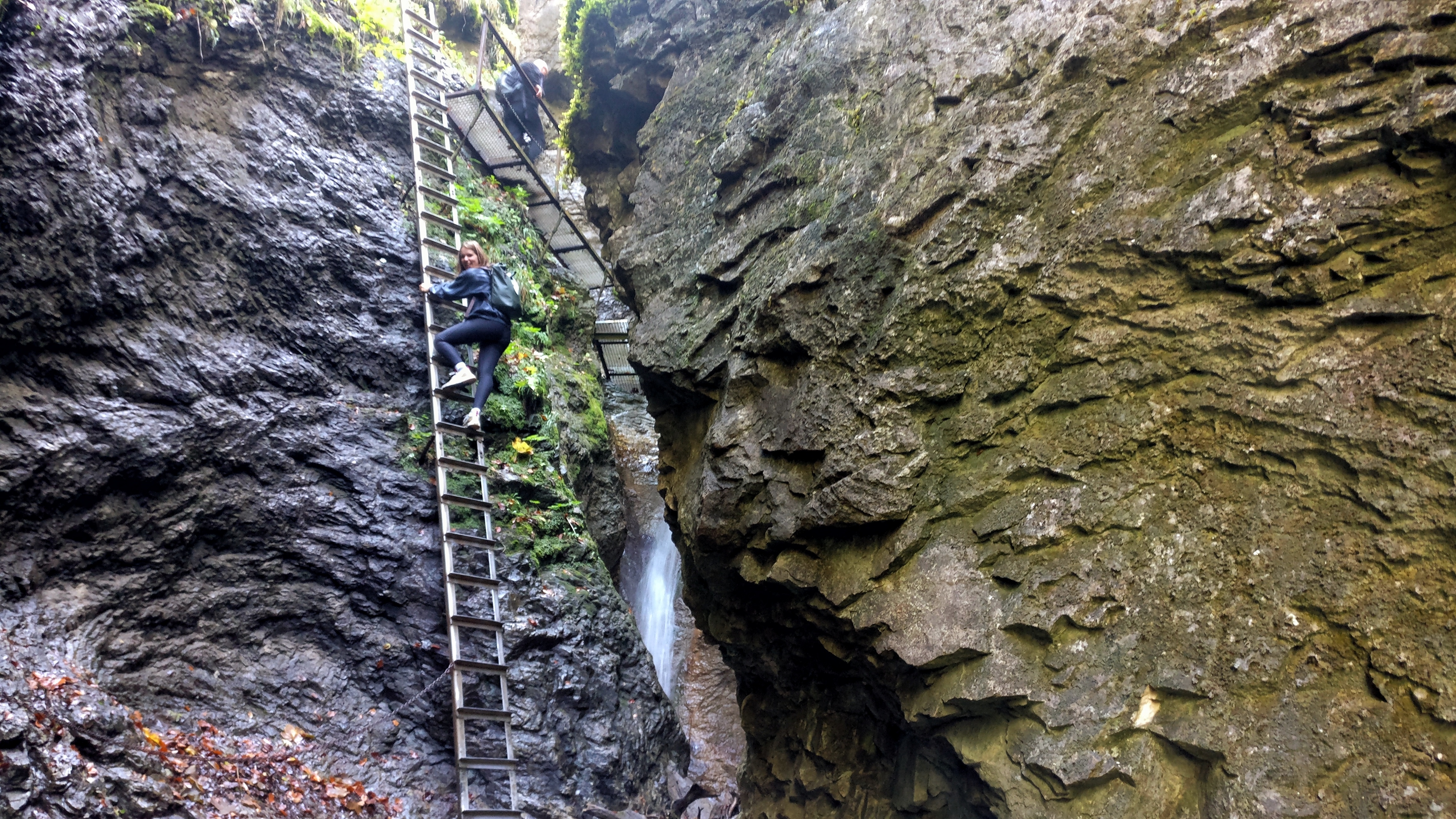 Für unsere dritte und vorerst letzte Wanderung geht es das Flussbett einer Schlucht hinauf — mal über Leitern und Stahltritte, mal über nur leicht angefaulte Holzstege. Für noch mehr Nervenkitzel steht, wenn man den Schildern glauben schenkt, nur die kostenlose Testversion einer Ultraschall-Bären-Glocken-App zwischen uns und einer Horde aggressiver Braunbären.